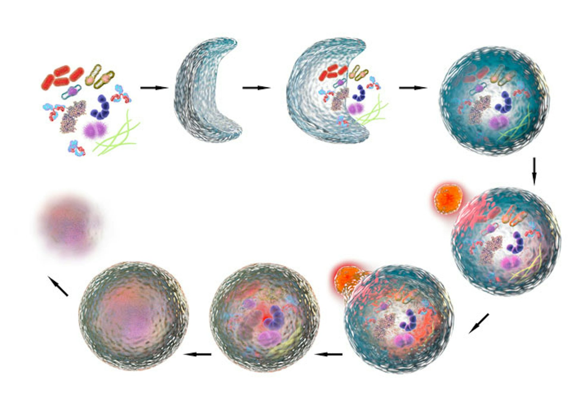 Белки, которые «неправильно» свернулись, старые органеллы, вирусы и бактерии, которые могли поглотить клетки иммунной системы, попадают в лизосомы и подвергаются уничтожению. Лизосома напоминает пузырек внутри клетки с ферментами, которые уничтожают ненужное. Таким образом наши клетки «делают уборку».