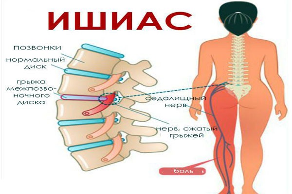 В результате такого сдавления нерв может воспалиться. Общее название такого недуга – радикулит, а если воспаление касается седалищного нерва — то его обозначают более конкретным термином «ишиас». Боль при ишиасе концентрируется в поясничной области и распространяется на ягодицу, бедро по ходу седалищного нерва.