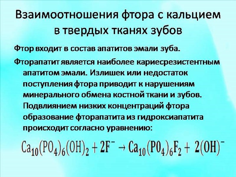 Фтор участвует в образовании костной ткани и формировании эмали и дентина зубной ткани. Фтор также имеет очень сильно выраженный противокариесный эффект, который объясняется замещением гидроксильной группы (OH-) гидроксиапатита эмали на фтор.