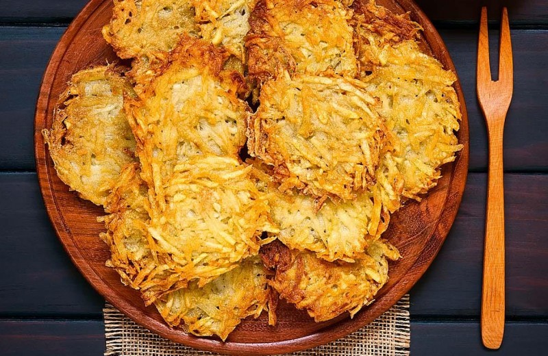 Тертый картофель и лук смешать с яйцами, мукой, мускатным орехом и щепоткой соли. Быстро обжаренные до золотисто-коричневого цвета, подаются с яблочным соусом.