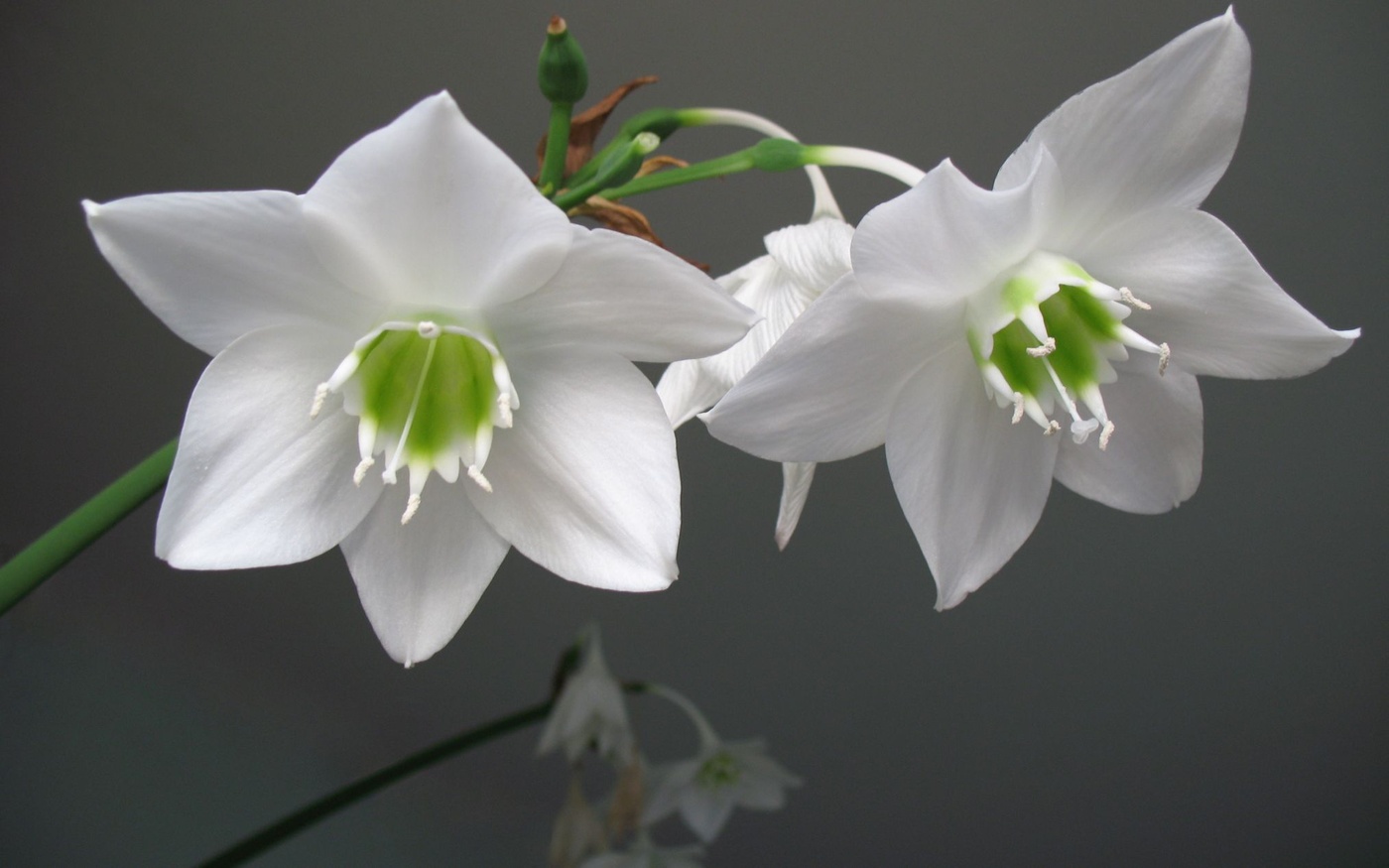 - Пока не появятся бутоны, растение надо спрыскивать прохладной водой (обязательно мягкой). Разрешается ухаживать за цветком, используя стимуляторы роста, при этом надо стараться не касаться соцветий. Далее цветы надо притенить, иначе на них могут появиться ожоги.