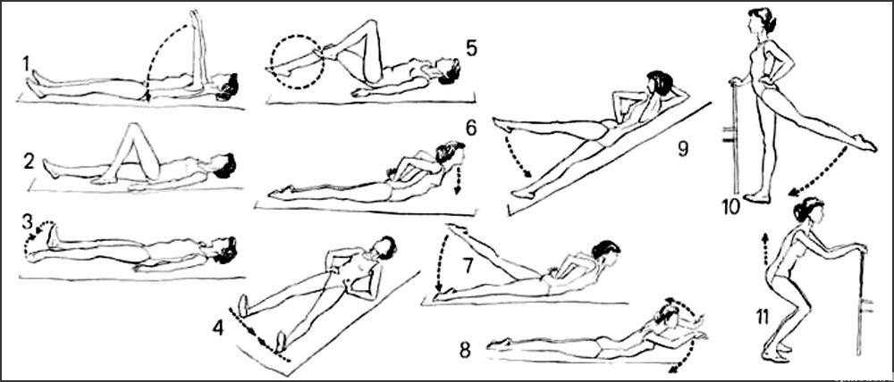 Желательно перед упражнениями провести разминку. Это разогреет мышцы, выведет из депо дополнительный объем крови и насытит ткани кислородом. Традиционные занятия включают: