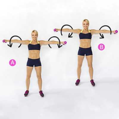 Упражнения для дряблых рук — недели 3 и 4- Круговые движения руками 30 сек x 4- Делайте 30 сек по часовой стрелке и 30 сек против часовой стрелки.